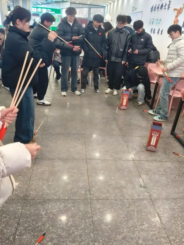 整整齐齐的餐桌旁,数套精致的投壶器具一字排开。同学们摩拳擦掌、踊跃参与,手持箭矢凝神瞄准,或稳投命中,或巧掷得分,“十发十中”的佳绩引得全场喝彩,即便未能如愿的同学也笑意不减。大家在投壶中不仅体验了古人雅趣,更点燃了现场的竞技热情,拉近了同学间的距离,为活动增添了满满的欢乐气息。