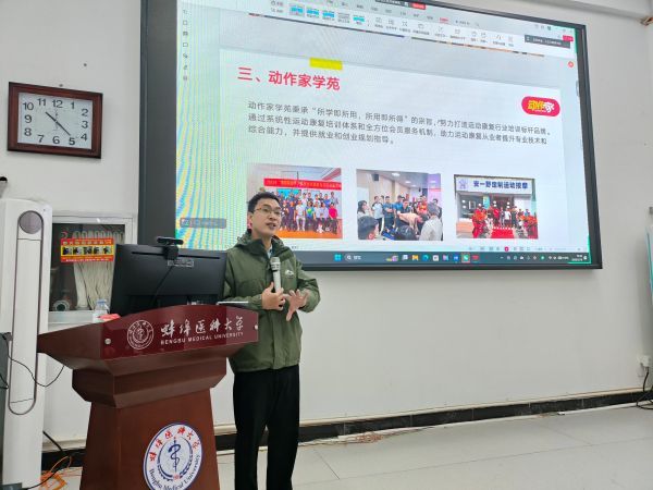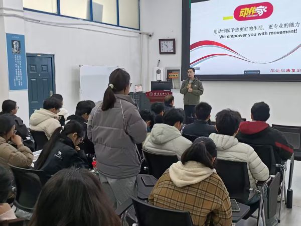 3 月 16 日上午,线下宣讲会如期开展。动作家学苑院长、安一野运动按摩 CEO 黄永增先生以运动康复行业市场规模与发展趋势为切入点,系统介绍了企业在运动损伤评估、功能性训练、运动表现提升等核心业务板块的实操场景。他指出,随着全民健身意识的普及,专业运动康复人才需求持续攀升,企业在招聘中格外看重应聘者的实操能力、沟通素养与终身学习意愿,鼓励同学们在校期间积极考取专业资格证书,筑牢专业核心竞争力。
