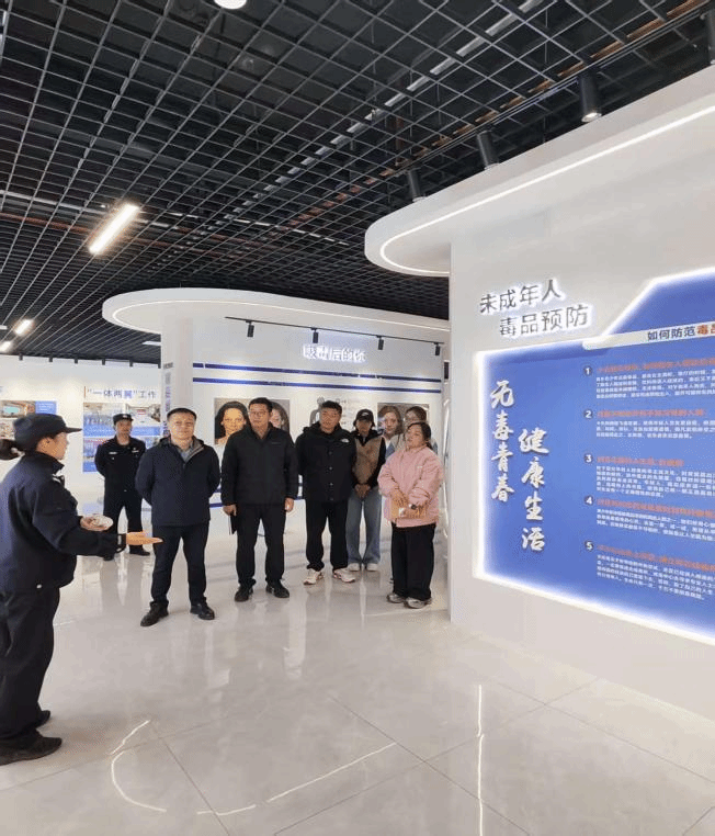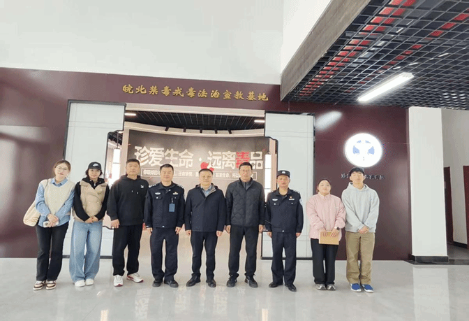 活动伊始,在蚌埠戒毒所相关负责人陪同下,叶培结一行先后实地参观了戒毒所内部管理区域、康复训练场地,详细了解戒毒人员日常管理、康复训练开展、生活保障等工作情况,直观掌握戒毒场所康复工作实际场景与现实需求。随后,一行人前往皖北禁毒戒毒法治宣教基地进行参观学习,通过现场观看毒品仿真模型、法治宣传展板、真实戒毒案例展示,全面了解皖北地区禁毒戒毒工作形势、毒品危害及法治宣教成果,进一步深化对禁毒戒毒工作系统性、专业性的认知,为后续精准开展校所合作奠定坚实实践基础。